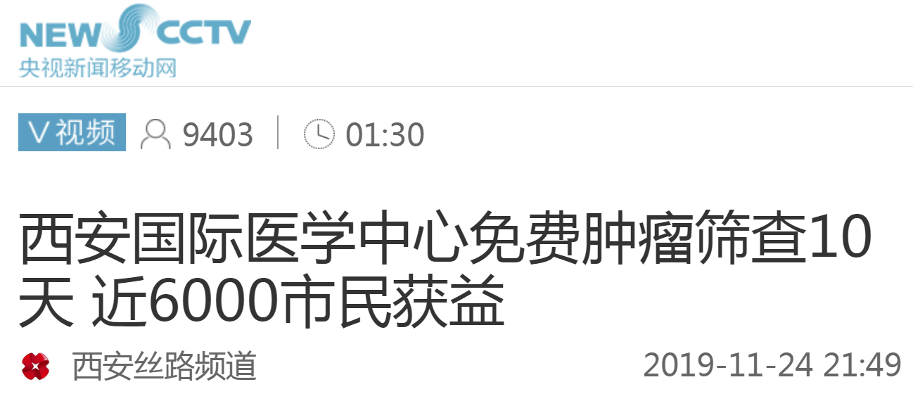 央視新聞移動網(wǎng)報道—西安國際醫(yī)學(xué)中心免費(fèi)腫瘤篩查10天 近6000市民獲益。點擊閱讀。