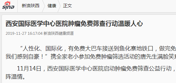 新浪網(wǎng)報(bào)道—西安國(guó)際醫(yī)學(xué)中心醫(yī)院腫瘤免費(fèi)篩查行動(dòng)溫暖人心。點(diǎn)擊閱讀