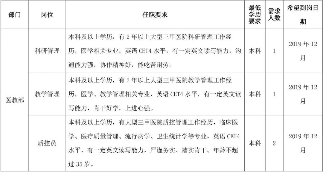 擁護黨的路線、方針、政策;遵守國家法律、法規(guī);熱愛本職工作,責(zé)任心強,有良好的職業(yè)道德,認同國際醫(yī)學(xué)價值理念,愿意投身醫(yī)療事業(yè);所學(xué)專業(yè)必須與應(yīng)聘崗位要求相符或必須具有相關(guān)從業(yè)經(jīng)歷。