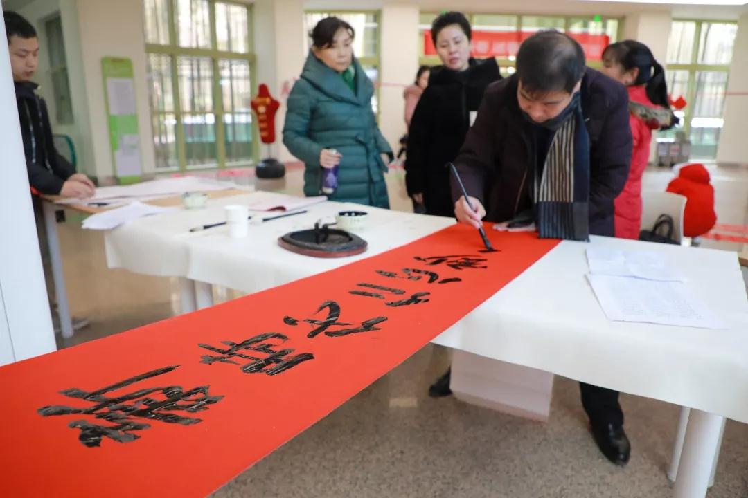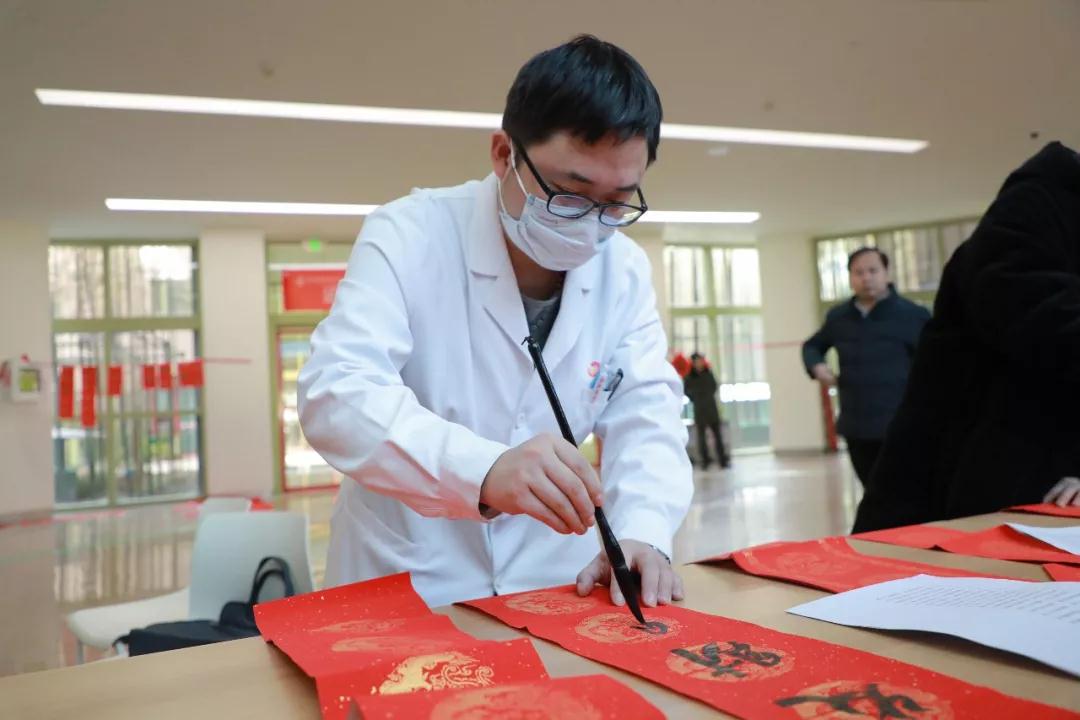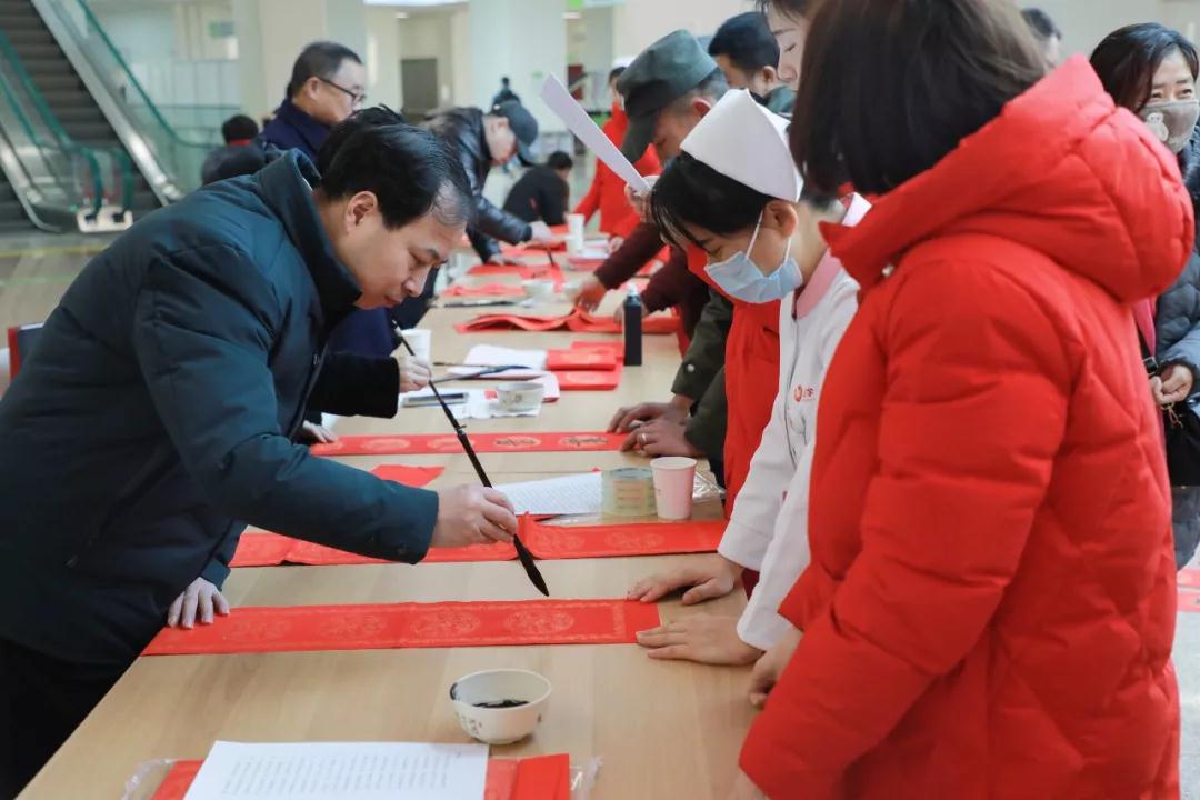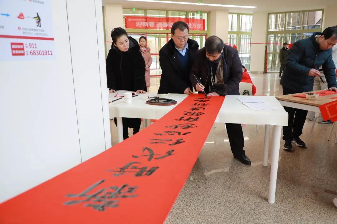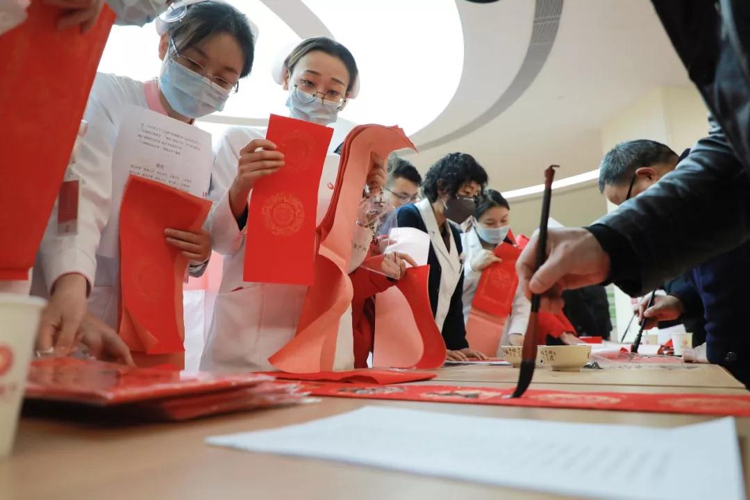 室外寒冬隆隆,室內(nèi)暖意融融,門診大廳人潮涌動(dòng)。集五福,來西安國(guó)際醫(yī)學(xué)中心醫(yī)院!火紅的“?!弊譅I(yíng)造出喜慶祥和的氛圍,活動(dòng)邀請(qǐng)了中國(guó)榜書家協(xié)會(huì)副主席兼中國(guó)社會(huì)藝術(shù)委員會(huì)副會(huì)長(zhǎng)、中國(guó)榜書家協(xié)會(huì)陜西省分會(huì)主席雷婉萍及陜西省書法家協(xié)會(huì)、西安市書法家協(xié)會(huì)的名家和院內(nèi)書法愛好者們親筆書寫春聯(lián)。一幅幅金鉤鐵劃的春聯(lián)飽含真摯祝福,一個(gè)個(gè)飄逸靈動(dòng)的漢字躍然紙上。除了傳統(tǒng)春聯(lián)還有新年新意,宣傳策劃部征集的原創(chuàng)春聯(lián)內(nèi)容積極向上,以新春祝福、歌頌西安國(guó)際醫(yī)學(xué)中心醫(yī)院為主題,溫暖的祝福送大家,受到一致好評(píng)。