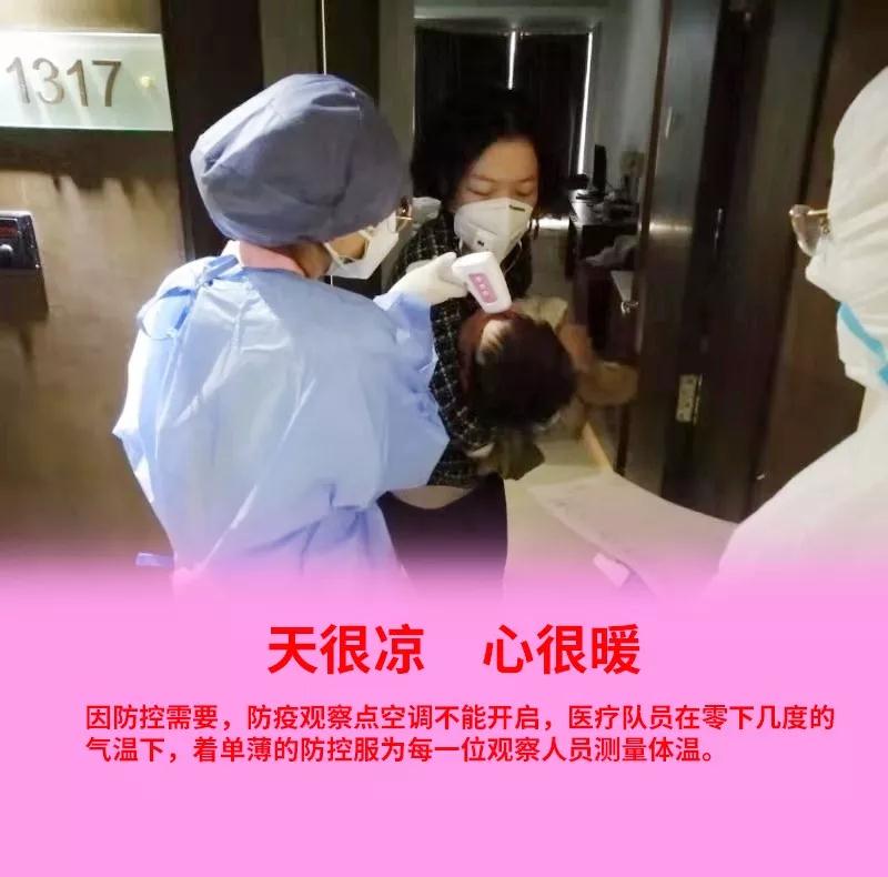 這支醫(yī)療隊(duì)由3名醫(yī)生、5名護(hù)士組成,分別是房武寧、張曉敏、王婧3位醫(yī)生;護(hù)士為白容容、陳蕓、王亞馨、燕瑞娥、田橋。身穿不透氣的防護(hù)服,醫(yī)護(hù)人員時(shí)時(shí)刻刻與時(shí)間拼耐心、與疫情變化拼細(xì)心。留觀人員中有16名70歲以上的老人,6名3歲以下的兒童。他們體質(zhì)較弱,需要更多的關(guān)懷與呵護(hù)。護(hù)士王亞馨每天要在樓上往返7、8趟為他們測(cè)體溫、安撫情緒。“我也時(shí)常想念家人,春節(jié)沒(méi)法和他們一起過(guò)年。現(xiàn)在,這里的老人和孩子就是我的家人?!闭f(shuō)著,豆大的汗珠順著她的眼睫毛滑落。即便超負(fù)荷工作著,她也從未喊過(guò)苦叫過(guò)累。