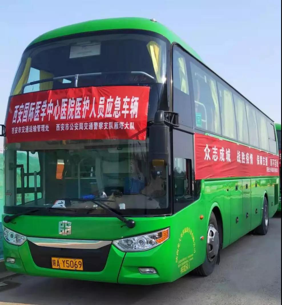 陜西光大外事旅游車務(wù)有限公司也無償為西安國際醫(yī)學(xué)中心醫(yī)院提供8輛大巴車,用于接送醫(yī)務(wù)人員上下班,并為醫(yī)護人員提供點對點的通勤服務(wù)。