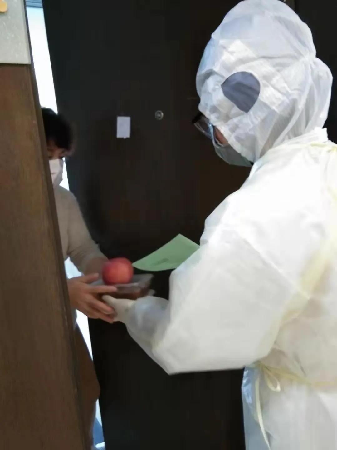 在這里的每一天,“累”是所有醫(yī)務(wù)工作者的共同感受,因?yàn)楦綦x點(diǎn)接受的大都是從武漢回來的人群,所以我們都要做好三級(jí)防護(hù)的自我保護(hù)措施。這里被隔離者都是我們的親人,生活起居,心理輔導(dǎo),事無巨細(xì)都由我們照料。記得剛來的那幾天,穿著不透氣的隔離衣給留觀者送餐時(shí),送到一半時(shí)突然感覺自己呼吸不暢,后面的衣服都濕透了,怕自己撐不住,趕快跑到安全通道脫下面罩,解開隔離衣,那一刻好想休息片刻,但是看著箱子里的飯菜,我又重新穿起了隔離衣。我的放松會(huì)讓飯菜變涼,家人們吃了會(huì)不舒服。想到這里,我邁出堅(jiān)定的步伐,加入到戰(zhàn)斗中。