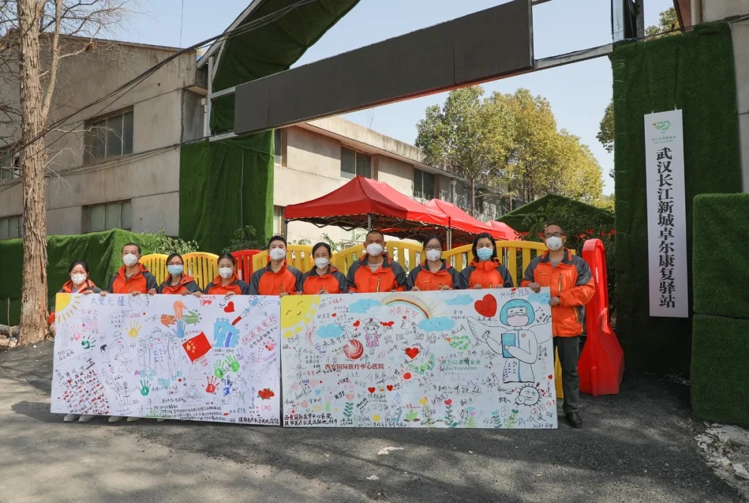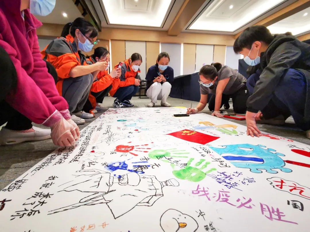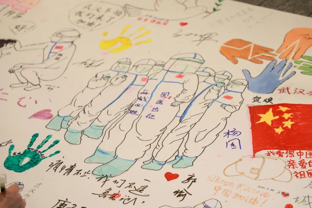 這兩幅畫板由醫(yī)療隊員和駐地的志愿者共同創(chuàng)作,一支支畫筆繪出全體人員戰(zhàn)“疫”祝福心聲:“武漢加油,中國必勝。”