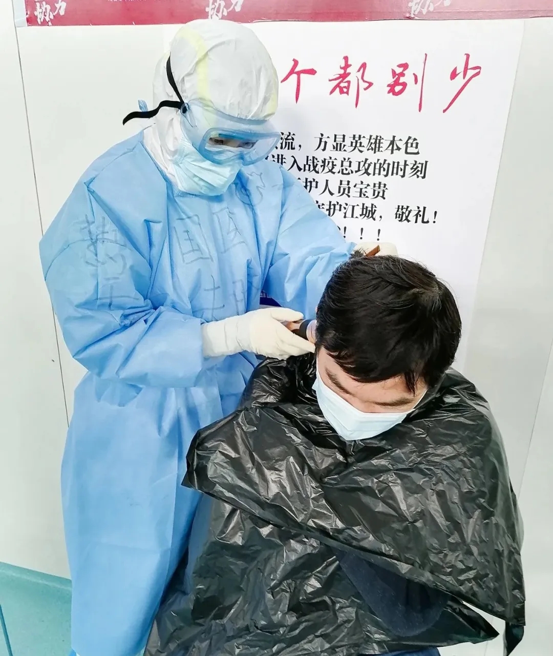 1艙有康復(fù)人員想理發(fā),手頭沒(méi)有工具,朱晴護(hù)士長(zhǎng)得知后,聯(lián)系下個(gè)班次護(hù)士帶來(lái)推子,給大家理發(fā)。“看你動(dòng)作很嫻熟啊,以前練過(guò)的吧”,“圍觀群眾”打趣道?!艾F(xiàn)學(xué)現(xiàn)賣(mài),大家要求不要太高,有壓力?。 敝烨缯f(shuō)。一直推到推子沒(méi)電,朱晴給6位康復(fù)人員簡(jiǎn)單修剪了頭發(fā)。得知朱晴是西安醫(yī)療隊(duì)的護(hù)士,大家都親切的稱她“肉夾饃”!