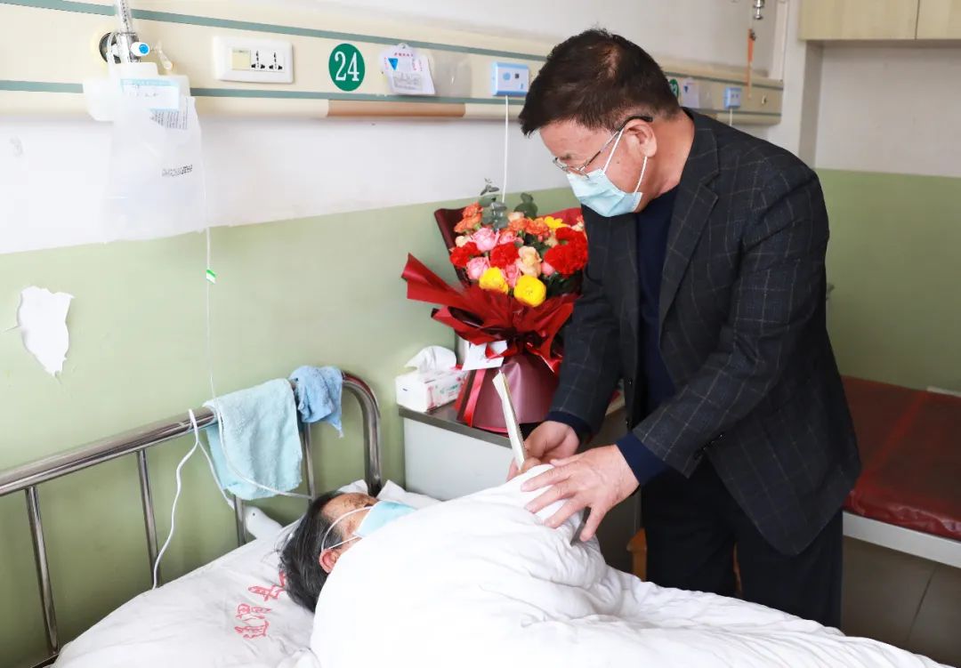 你在前方打仗,我在后方保障!醫(yī)院指派專人與醫(yī)療隊家屬一一對接,詳細(xì)了解前方親屬們實際困難,搭建與隊員家屬的聯(lián)系平臺,第一時間了解并解決家屬們的困難。3月18日,王志峰總經(jīng)理、腫瘤醫(yī)院院長南克俊教授等一行6人,驅(qū)車300多公里遠(yuǎn)赴甘肅省通渭縣人民醫(yī)院,看望85歲,有著60年黨齡,身患重病的李斌同志母親,為老人送上了慰問品及慰問金。