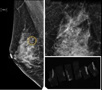 46歲的某女士在西安國際醫(yī)學(xué)中心醫(yī)院體檢時(shí),行乳腺X線攝影(俗稱鉬靶)發(fā)現(xiàn)右乳可疑簇狀鈣化,分布范圍不到1厘米,臨床觸不到,超聲很難發(fā)現(xiàn),但是這種鈣化風(fēng)險(xiǎn)比較高,依據(jù)國際BI-RADS指南需要明確病理!
