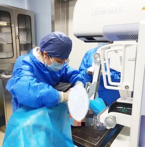 西安國際醫(yī)學(xué)中心醫(yī)院影像診療中心陳寶瑩副主任帶領(lǐng)的團(tuán)隊(duì),采用全數(shù)字化乳腺X線三維立體定位系統(tǒng)可實(shí)施。這個(gè)團(tuán)隊(duì)的成員大部分來自知名三甲醫(yī)院,有著十余年影像引導(dǎo)下乳腺介入診療的經(jīng)驗(yàn),X線引導(dǎo)穿刺定位和活檢例數(shù)居西北前列。為減少患者創(chuàng)傷,在詳細(xì)判讀了患者資料,并與患者及甲乳外科劉曉敏主任充分溝通的基礎(chǔ)上,團(tuán)隊(duì)確定采用全數(shù)字化乳腺X線三維立體定位系統(tǒng)下實(shí)施粗針活檢。