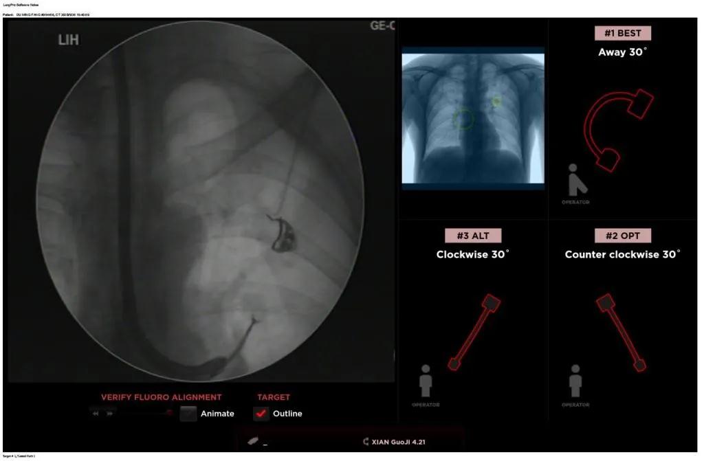 患者是一位59歲的男性,入院診斷左固有上葉前段肺小結(jié)節(jié),大小1.5cm*1.5cm。因?yàn)椴≡钆c支氣管不相通,無法開展經(jīng)支氣管自然腔道的活檢,而且病變距離胸壁較遠(yuǎn)、肋骨阻隔進(jìn)針線路、病灶周圍有血管包繞,如果進(jìn)行CT引導(dǎo)下經(jīng)皮肺穿刺活檢,則存在較大的氣胸、出血等并發(fā)癥的風(fēng)險。