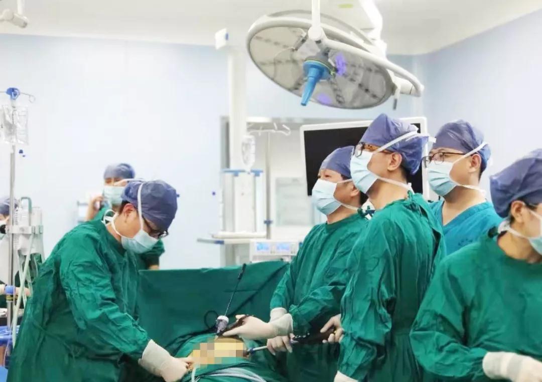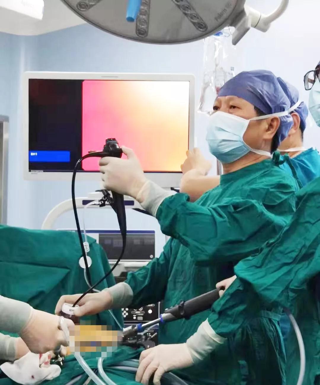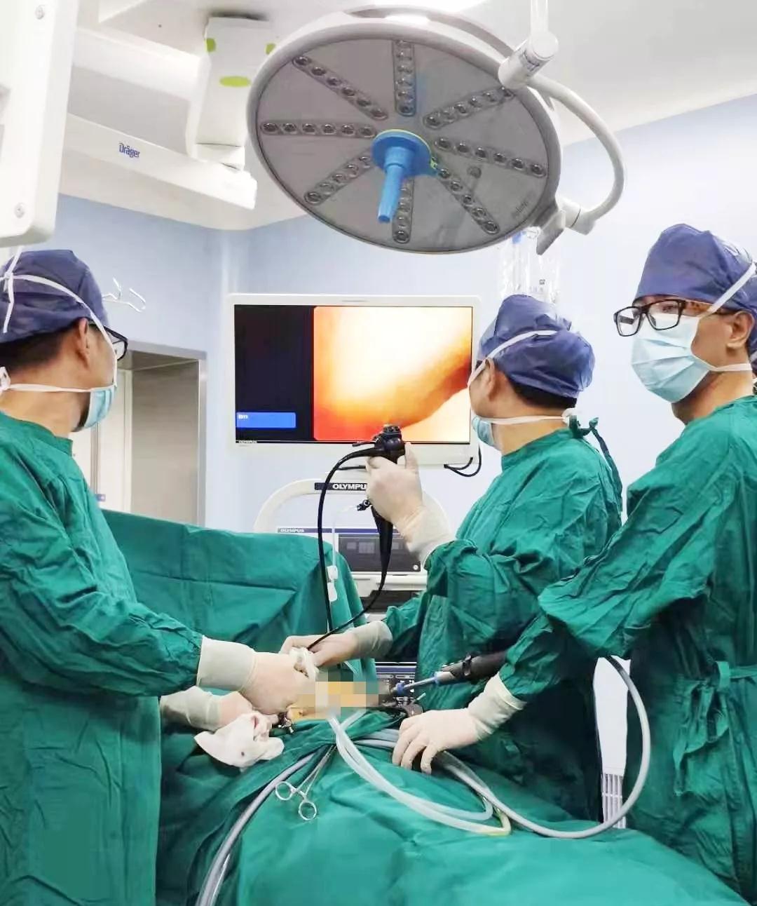 排除手術(shù)禁忌后,王湘輝主任親自主刀,為患者在全麻下行腹腔鏡聯(lián)合膽道鏡下膽總管切開膽道碎石取石 膽囊切除 T管引流術(shù)。手術(shù)中發(fā)現(xiàn)膽囊腫的比茄子還大,周圍組織脆的一碰就流血,膽總管明顯擴張(1.5cm),切開膽管后見乳白色膿性膽汁溢出,膽道鏡下見膽管內(nèi)壁充血水腫,膽總管下段緊緊卡著一枚指甲蓋大的金黃色結(jié)石,手術(shù)難度很大。王湘輝主任用膽道液電碎石儀打碎結(jié)石再用膽道鏡一塊塊取凈,用精湛的手術(shù)技巧疏通膽道。之后在腹腔鏡下順利切除重度炎癥的膽囊,用近三小時圓滿完成手術(shù)。術(shù)后第二天病人就能下床活動正常吃飯了,到第6天就順利出院了。