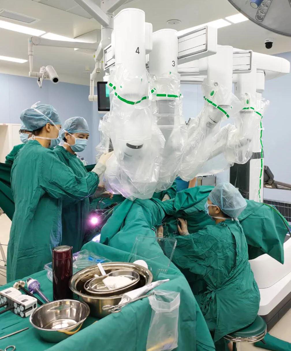 婦科腫瘤醫(yī)院院長王海琳聚精會神地操控著達(dá)芬奇Xi(第四代)手術(shù)機(jī)器人,3只機(jī)械臂相互配合,通過肚臍“鉆”進(jìn)腹腔,嫻熟地將剝離出的患者子宮肌瘤和左側(cè)卵巢畸胎瘤放入標(biāo)本袋中,沿肚臍穿刺孔取出,至此,第四代達(dá)芬奇機(jī)器人在王海琳的操作下,成功完成陜西省單孔手術(shù)“首秀”。