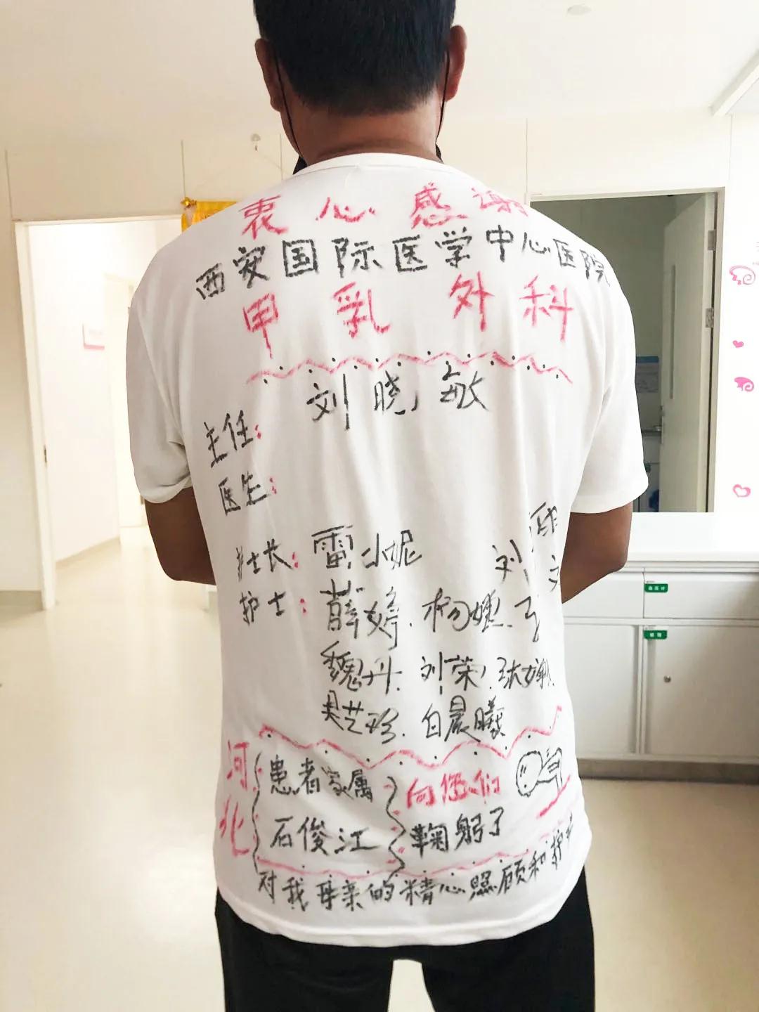 出院前一天,患者家屬想用一種特殊的方式記住醫(yī)生的恩情:“很感謝你們對(duì)我母親的照顧,你們?cè)谖疫@件襯衫上簽名,我開車?yán)浀臅r(shí)候就穿這件衣服,我走到哪里就念著你們到哪里,宣傳到哪里!我想讓更多人知道西安國際醫(yī)學(xué)中心這家醫(yī)院!這家醫(yī)院不僅就醫(yī)環(huán)境好,醫(yī)護(hù)人員的服務(wù)態(tài)度也很棒,我在這里就醫(yī),讓我感覺到前所未有的溫暖,我想讓那些同樣飽受病痛折磨的人早日得到身心解放,他們也能感受到溫暖。”