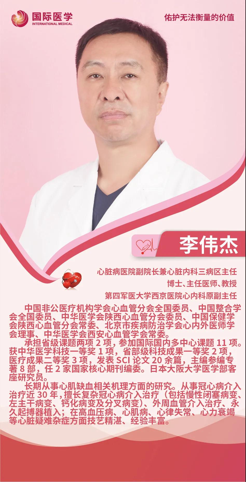 李偉杰,第四軍醫(yī)大學(xué)西京醫(yī)院心內(nèi)科原副主任,博士、主任醫(yī)師、教授。先后承擔(dān)了多項(xiàng)國際國內(nèi)及省部級(jí)課題,獲得過中華醫(yī)學(xué)科技一等獎(jiǎng)等多重獎(jiǎng)項(xiàng),長期從事于血管管介入治療,擅長冠心病復(fù)雜病變的介入手術(shù)治療,包括慢性閉塞病變、左主干病變、鈣化病變及分叉病變,在外周血管的介入治療級(jí)其他心血管疾病的診療方面具有非常豐富的經(jīng)驗(yàn)。李偉杰在西京醫(yī)院工作多年,掛號(hào)一票難求,因和藹可親的態(tài)度、精湛的醫(yī)技、崇厚的醫(yī)德獲得了一大批的患者“粉絲”,是患者口中的明星醫(yī)生,醫(yī)生口中的業(yè)界“男神”。