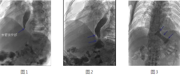 在韓國(guó)宏教授的帶領(lǐng)下,專(zhuān)家團(tuán)隊(duì)經(jīng)多方面評(píng)估后,決定在DSA下為劉大爺行食管造影 食管支架置入術(shù)。術(shù)中透視可見(jiàn)食管中上段擴(kuò)張明顯,食管下端賁門(mén)口明顯狹窄,造影劑淤積,呈線(xiàn)性緩慢進(jìn)入胃腔(見(jiàn)圖1),經(jīng)過(guò)準(zhǔn)確定位后,釋放食管支架,再次造影可見(jiàn)造影劑經(jīng)支架順利進(jìn)入胃腔(見(jiàn)圖2)。2天后再次造影見(jiàn)食管支架完全打開(kāi),位置正常,造影劑可順利通過(guò)支架(見(jiàn)圖3)。