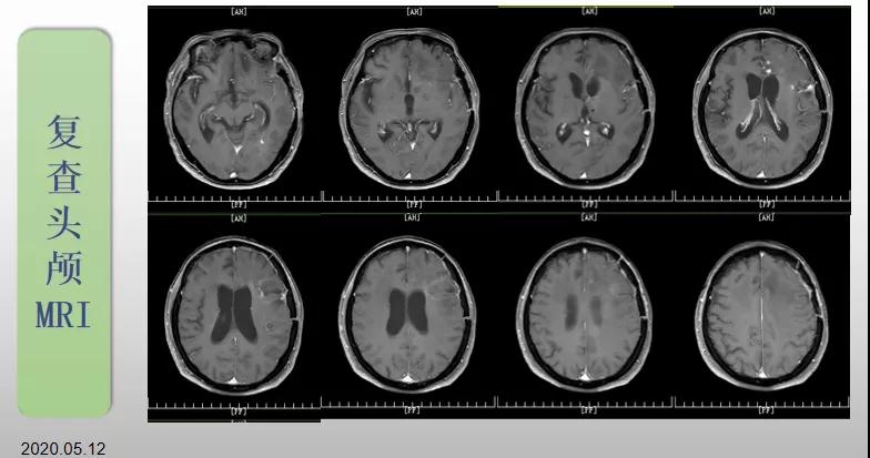 70歲的郝女士去年曾在外院查出“左額島葉”膠質(zhì)母細(xì)胞瘤(WHO Ⅳ級),并做了左側(cè)額島葉占位性病變切除術(shù)。術(shù)后進行了同步放化療。由于治療條件有限,郝女士慕名來到我院就診。賀世明主任率領(lǐng)醫(yī)護團隊立即為郝女士進行了全面的檢查,決定為其進行綜合治療 電場治療。經(jīng)過三個多月的綜合治療,患者復(fù)查頭顱MRI病變較前明顯縮小。出院時,郝女士神志清醒,睡眠飲食正常,說話很流利?!拔沂翘芍M來的,現(xiàn)在不用人攙扶,自己就可以走出病房了?!焙屡坷t(yī)護人員的手說。
