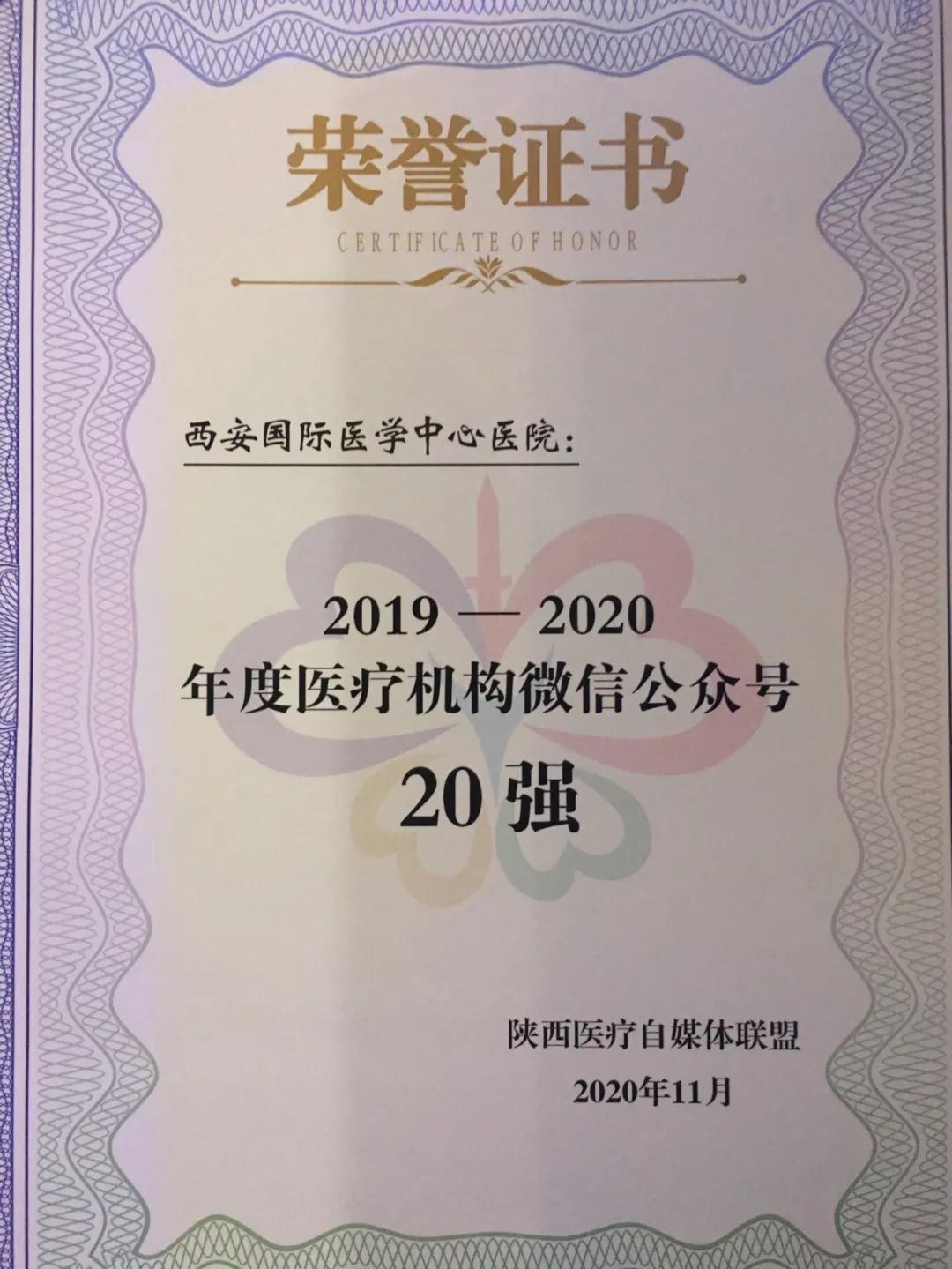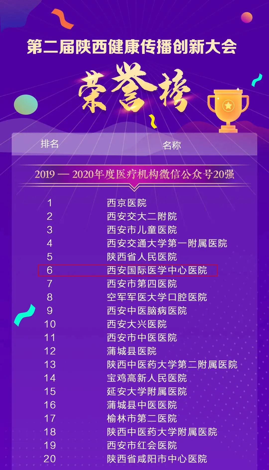 11月25日,由陜西省衛(wèi)生健康委員會、陜西省醫(yī)師協(xié)會指導,陜西醫(yī)療自媒體聯(lián)盟、陜西省衛(wèi)生健康干部培訓中心承辦的第二屆陜西健康傳播創(chuàng)新大會在西安召開。西安國際醫(yī)學中心醫(yī)院微信公眾號榮獲2020年陜盟醫(yī)療機構微信公眾號第六名。