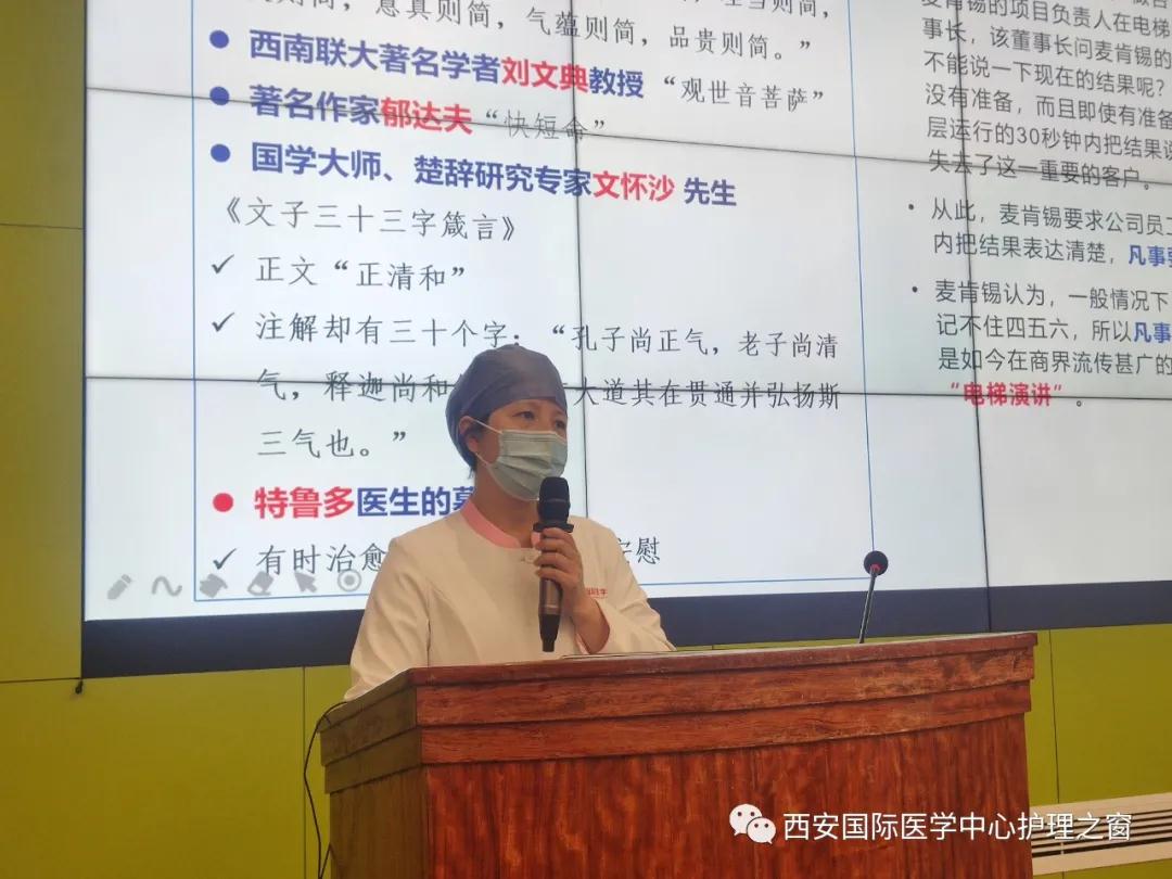 王汝娜總護(hù)士長(zhǎng)分享了“怎樣做一名優(yōu)秀的護(hù)士長(zhǎng)”,從護(hù)士長(zhǎng)應(yīng)該具備的9個(gè)方面的素質(zhì)及護(hù)士長(zhǎng)怎么實(shí)施管理等方面提出了許多真知灼見(jiàn),讓護(hù)士長(zhǎng)們備受啟發(fā),受益匪淺。