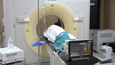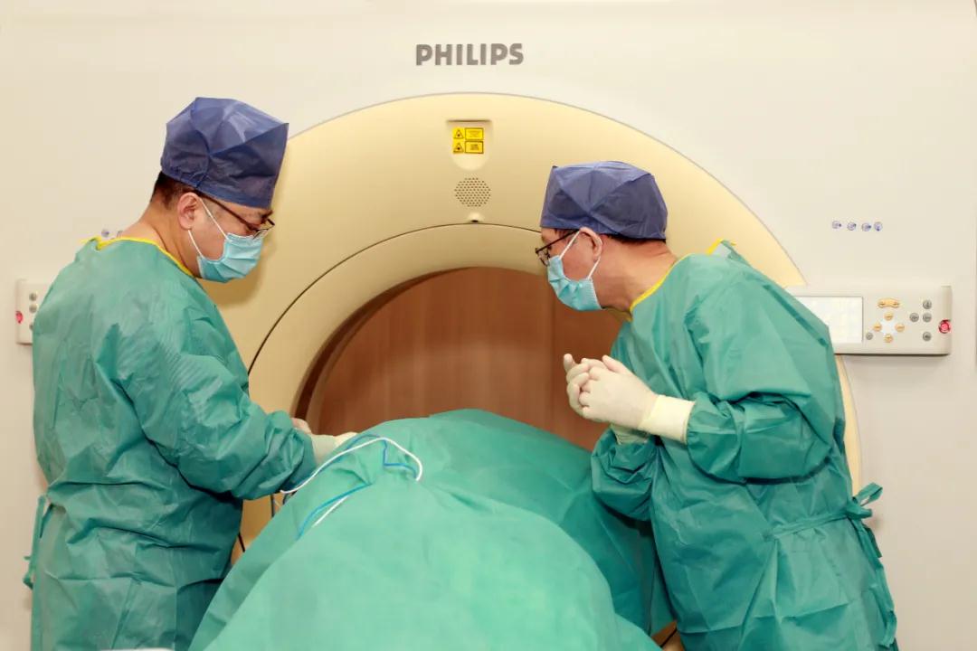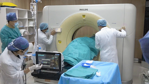 經(jīng)過放射治療中心陸軍主任的細(xì)致準(zhǔn)備與精準(zhǔn)定位,屈女士的射頻治療開始了?;颊卟扇∽髠?cè)臥位,麻醉醫(yī)生立即進(jìn)行靜脈全麻。在CT引導(dǎo)下,醫(yī)生手中的“消融針”,按照既定路線“穿引”,快速、準(zhǔn)確地插入右肺病灶部位,啟動射頻機(jī)器進(jìn)行了精準(zhǔn)的消融,右肺局部癌細(xì)胞一下子就被超高溫成功滅活了!經(jīng)CT掃查,無血?dú)庑?;患者生命體征平穩(wěn)。2個(gè)小時(shí)后,屈女士就下地活動了。