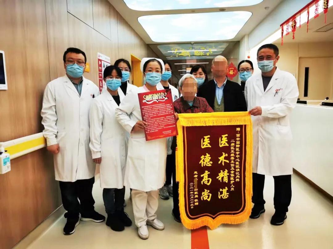 “醫(yī)生與護(hù)士們每天都早早到病房看望老人,耐心仔細(xì)詢問(wèn)病情,安撫老人情緒……我代表家人對(duì)全體醫(yī)護(hù)人員表示最衷心的感謝!”出院當(dāng)天,岳奶奶的兒女將感謝信與錦旗送到消化內(nèi)科二病區(qū)醫(yī)護(hù)人員手中。