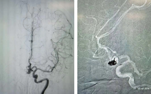 腦血管較外周血管更為脆弱、迂曲,對術者的操作技術及精準性要求特別高。術中,陸丹醫(yī)生通過股動脈穿刺、置入微導管,再通過微導管將彈簧圏送入動脈瘤腔內(nèi),利用彈簧圈的機械閉塞作用,達到防止動脈瘤破裂的目的。術后,患者各項生命體征平穩(wěn)。
