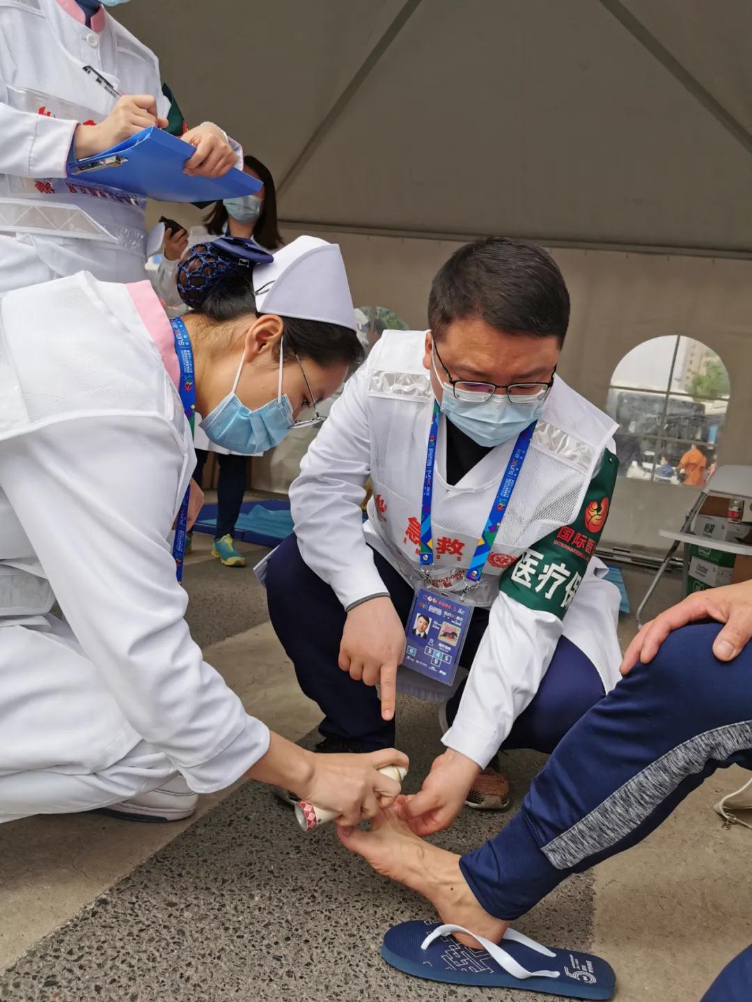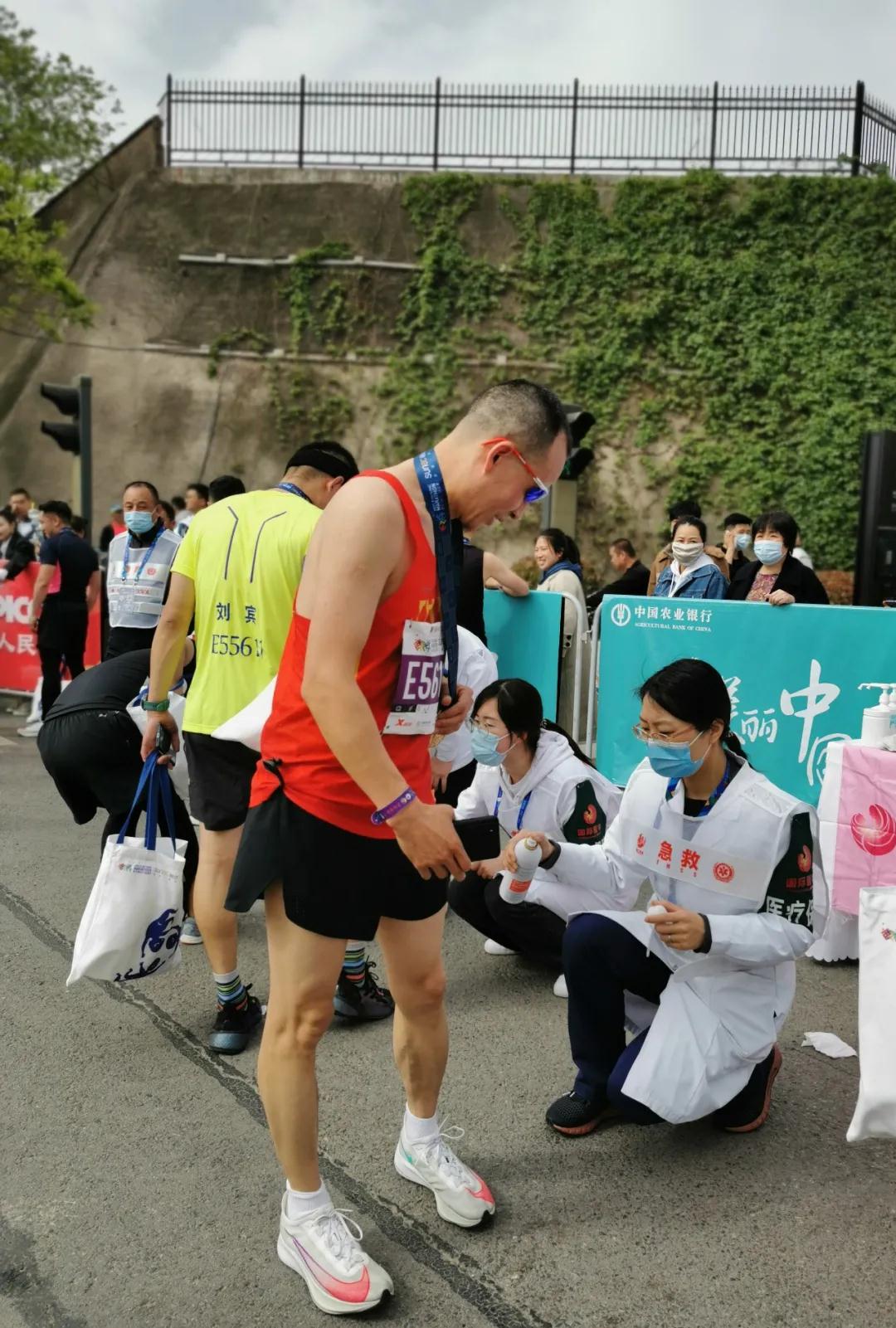 “醫(yī)生,我扭傷了腳踝,麻煩幫忙看看”,“護(hù)士,麻煩噴一些運動冰肌噴”……9點開始,奔跑大軍陸續(xù)抵達(dá),涂抹凡士林、提供糖鹽水、處理扭傷抽筋等醫(yī)療需求均得到回應(yīng),醫(yī)護(hù)人員各司其職,對運動員開展巡回指導(dǎo)和賽后恢復(fù)工作。