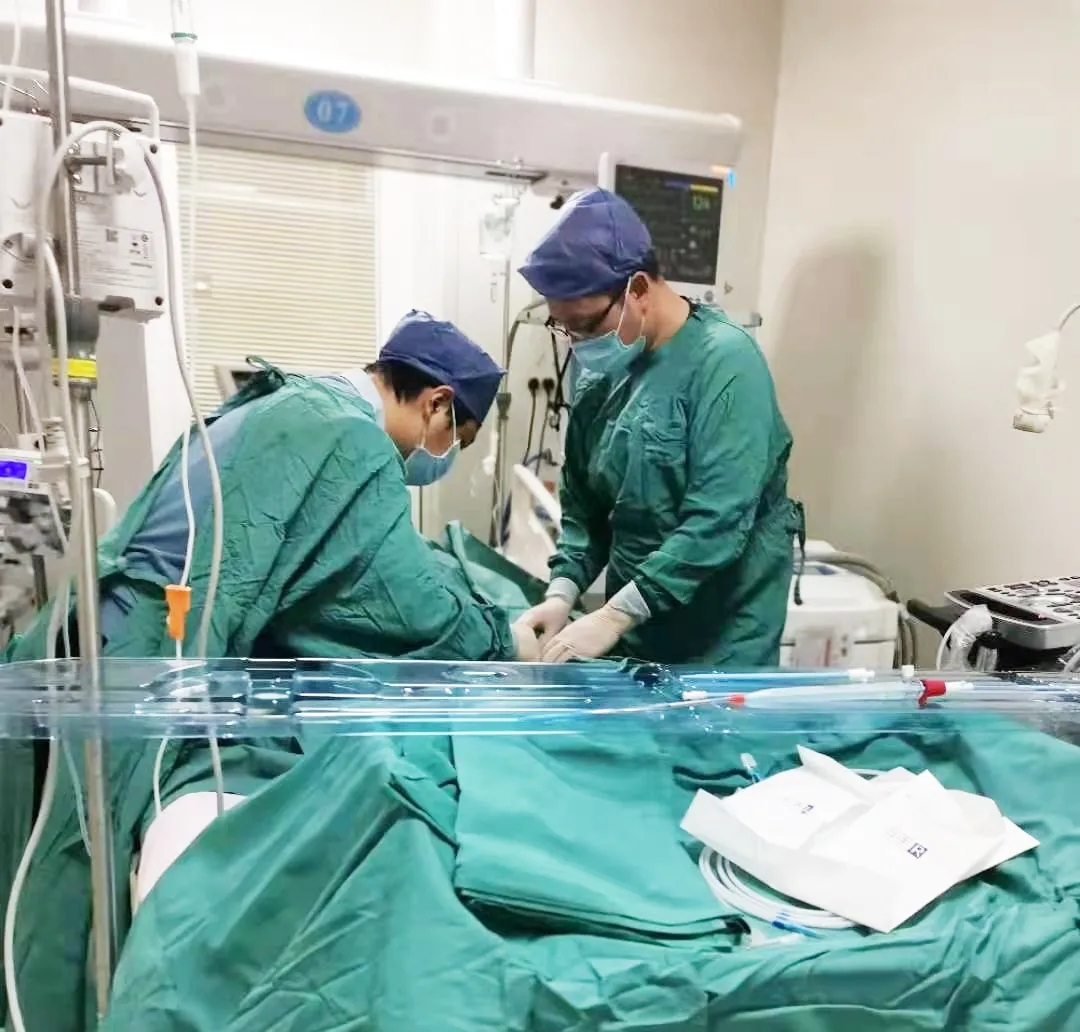 氣管插管后患者血氧飽和度仍然只有74%左右。呼吸內(nèi)科重癥監(jiān)護室陳麗展主任根據(jù)患者病情,建議盡早進行VV-ECMO治療——患者肺部感染嚴重,需要人工體外搭建一個“肺”暫時代替“病肺”工作,爭取挽救“病肺”時間同時維持患者正常呼吸,保證其他臟器正常運行。征得家屬同意后,呼吸內(nèi)科聯(lián)合心外科緊急會診,評估患者是否適合進行VV-ECMO治療,結(jié)果建議VV-ECMO治療。