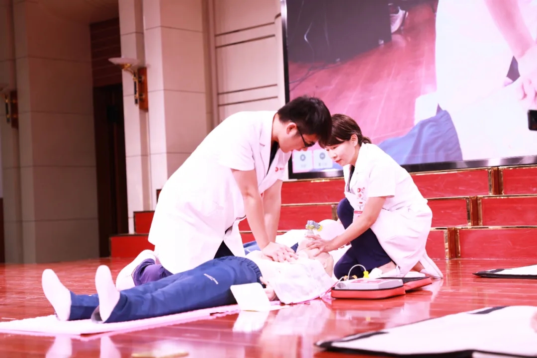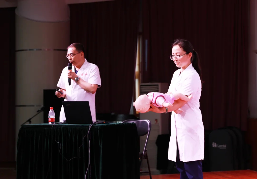 在多功能廳,王彬榮副主任進行理論授課;呂玉珠醫(yī)生、張榮榮護士長、許哈克分別進行了成人、兒童、嬰兒心肺復蘇術(CPR)模擬演練、體外自動除顫器(AED)的使用、海姆立克法、嬰兒氣道梗阻的緊急處理方法等操作演示,并以互動的方式邀請12名學生代表上臺進行了操作練習,老師們現(xiàn)場進行一對一的指導,為大家解答各種疑問,使他們對現(xiàn)場心肺復蘇術的全過程有了更加深刻的理解,也使學生們基本掌握了心肺復蘇法的操作技能。