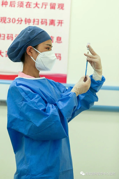 掃碼,拆開包裝,取出疫苗,拿出一次性針頭,扎進(jìn)瓶中,抽出液體,注射到接種對象胳膊上……今天的這位接種者,是西安國際醫(yī)學(xué)中心醫(yī)院護(hù)士楊婕接種的第13230人。
