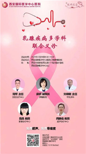 為方便患者就醫(yī),提高群眾乳腺健康意識,由西安國際醫(yī)學(xué)中心醫(yī)院腫瘤醫(yī)院、甲乳外科、放射治療中心、影像診療中心、超聲診療中心多位知名專家組成團(tuán)隊,為廣大乳腺疾病患者提供全面、專業(yè)及個體化診療,并提供免費乳腺超聲和骨密度檢查,歡迎掃碼報名。