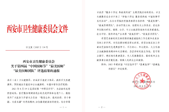 在中國醫(yī)師節(jié)到來之際,西安市衛(wèi)健委、高新區(qū)文旅健康局表彰了一批先進(jìn)醫(yī)療機(jī)構(gòu)、優(yōu)秀醫(yī)務(wù)工作者,西安國際醫(yī)學(xué)中心醫(yī)院3個科室、6名醫(yī)生獲得表彰。
