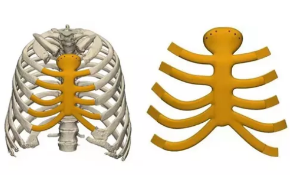 由于惡性腫瘤已經(jīng)侵蝕患者胸骨,且患者既往縱劈胸骨手術(shù),手術(shù)中不得不行全胸骨切除置換,因此需要使用人工胸壁置換術(shù)。西安國(guó)際醫(yī)學(xué)中心醫(yī)院打破傳統(tǒng)植入方式,通過(guò)分析患者增強(qiáng)CT掃描資料,計(jì)算出腫瘤大小,切除范圍及切除后需要植入材料的大小形狀,并通過(guò)3D打印技術(shù)制作出和患者解剖結(jié)構(gòu)完全相同的植入材料,植入物采用國(guó)際上先進(jìn)的聚醚醚酮(PEEK)材料,其力學(xué)結(jié)構(gòu)接近人體皮質(zhì)骨,具有重塑胸壁力學(xué)的顯著特性。由此來(lái)制作人工胸廓替代胸骨和部分肋骨。