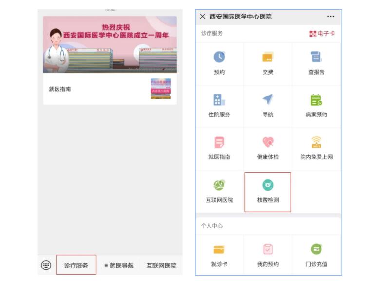 醫(yī)院核酸檢測(cè)已開(kāi)通線上預(yù)約,大家可通過(guò)“西安國(guó)際醫(yī)學(xué)中心醫(yī)院服務(wù)號(hào)”微信公眾號(hào)進(jìn)行預(yù)約。