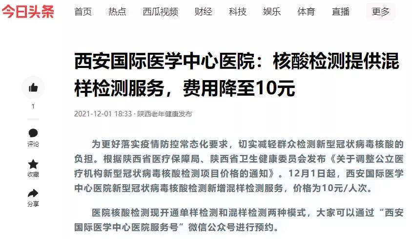 西安國際醫(yī)學(xué)中心醫(yī)院:核酸檢測提供混樣檢測服務(wù),費用降至10元