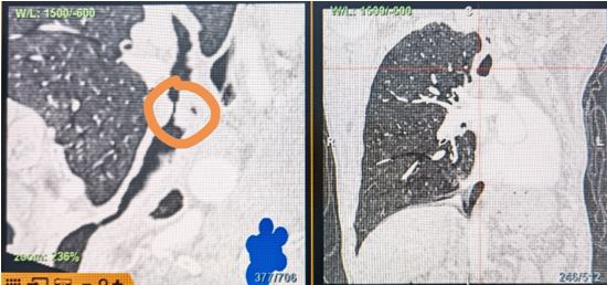 時間就是生命!了解患者病情后,歐陽海峰立刻啟動氣道梗阻緊急救治通道,協(xié)調(diào)院前轉(zhuǎn)運(yùn),急診快速入院流程。凌晨患者入院胸部CT顯示,現(xiàn)存唯一的呼吸通道在右主支氣管處,狹窄處僅約3毫米,患者命懸一線!