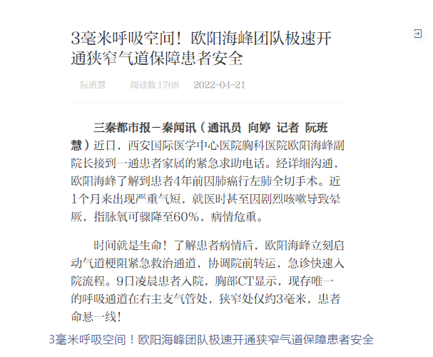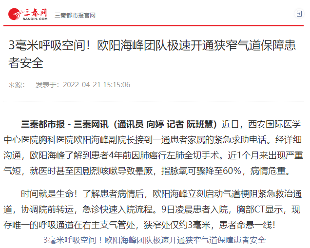 三秦都市報(bào):3毫米呼吸空間!歐陽(yáng)海峰團(tuán)隊(duì)極速開通狹窄氣道保障患者安全