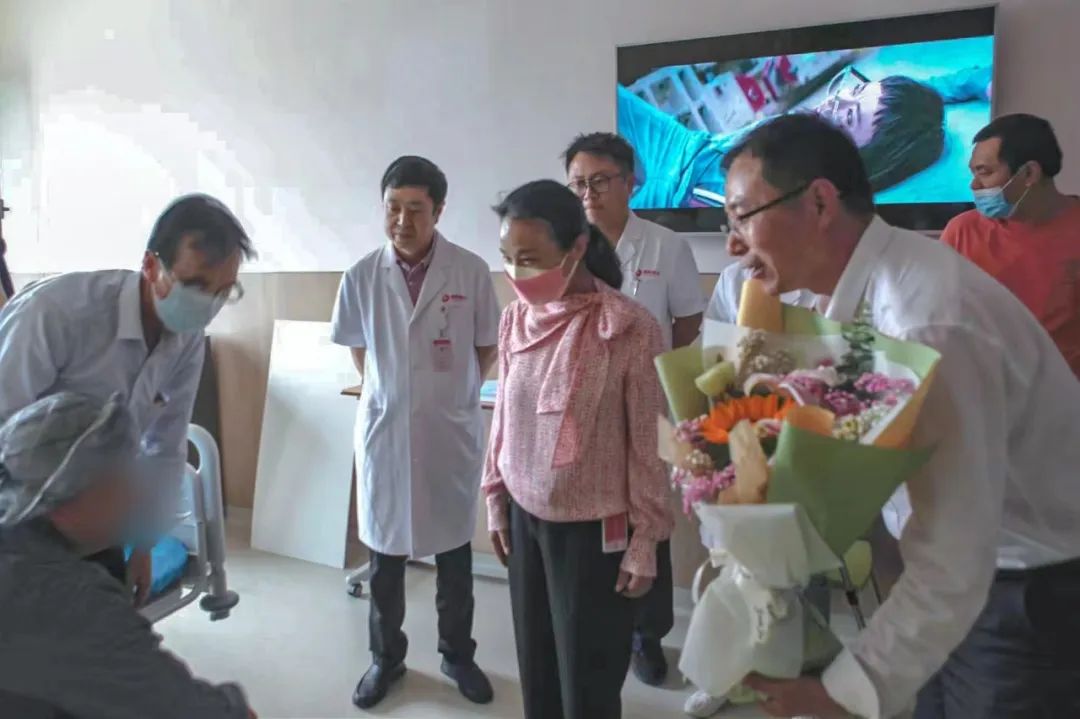 護士節(jié)前一日李女士出院時,國際醫(yī)學副董事長王愛萍、腦科醫(yī)院副院長賀世明為她送上鮮花和救助金,希望她早日康復(fù),和抗疫中千千萬萬的白衣天使一樣,繼續(xù)發(fā)光發(fā)熱。
