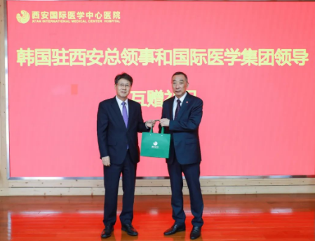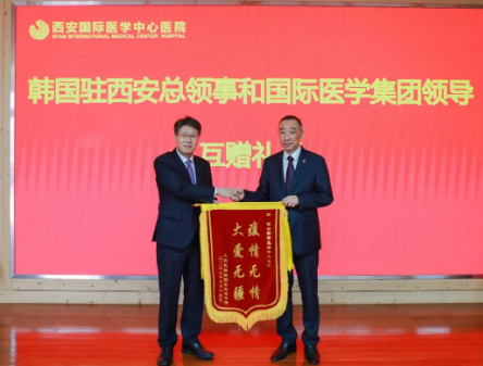 隨后,韓國(guó)駐西安總領(lǐng)事館向西安國(guó)際醫(yī)學(xué)中心醫(yī)院贈(zèng)送錦旗,雙方互贈(zèng)禮物并合影留念。