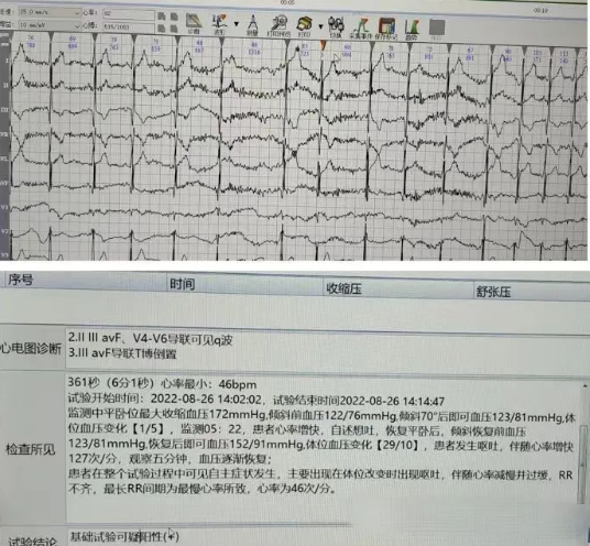 檢查前,心電檢查中心醫(yī)生仔細(xì)詢問患者病史,并簽署知情同意書后,進(jìn)行正式檢查。打開錄播系統(tǒng)及傾斜試驗(yàn)系統(tǒng),心電檢查中心張錄興主任帶領(lǐng)兩位醫(yī)生進(jìn)行看護(hù),傾斜前及傾斜后密切觀察患者的心率、血壓和自身狀態(tài)。當(dāng)傾斜70?后4分鐘患者心率及血壓開始變化,自述頭暈想吐。即可恢復(fù)平臥位后測量血壓,患者出現(xiàn)體位變化后發(fā)生嘔吐,伴隨心率由快變慢,并出現(xiàn)明顯竇性心動(dòng)過緩伴不齊,最慢可達(dá)46次/分,嘔吐過后心率逐漸上升90次/分,患者自述暈厥癥狀消失,血壓心率平穩(wěn)后,試驗(yàn)結(jié)束,診斷暈厥試驗(yàn)可疑陽性。