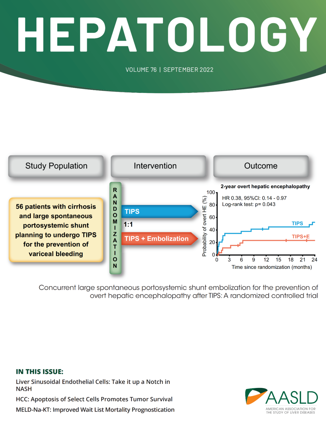 新近,西安國際醫(yī)學中心醫(yī)院消化病醫(yī)院韓國宏教授團隊的一項隨機對照試驗“經(jīng)頸靜脈肝內(nèi)門體靜脈分流術(TIPS)聯(lián)合自發(fā)性門體分流封堵預防術后顯性肝性腦病”的論著被最新一期的Hepatology雜志(IF=17.29,JCR:Q1)遴選為9月份封面文章(圖1)。該研究顯示TIPS聯(lián)合粗大分流道封堵能夠有效降低TIPS術后顯性肝性腦病的發(fā)生率,且不增加門靜脈高壓、分流道功能障礙和其他不良事件的并發(fā)癥風險[1]。