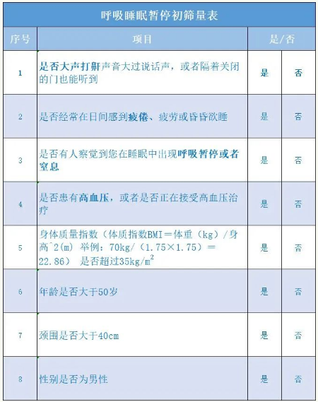 家人觀察打鼾者,呼嚕聲沒節(jié)奏,不規(guī)律,這種呼嚕不是好呼嚕。我們也可以通過一些簡單的量表自測,看是否有這個(gè)疾病的傾向。