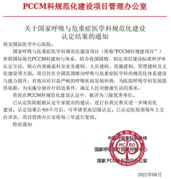 近日,國家呼吸與危重癥醫(yī)學(xué)科規(guī)范化建設(shè)項(xiàng)目管理辦公室發(fā)布新聞,西安國際醫(yī)學(xué)中心醫(yī)院獲國家呼吸與危重癥醫(yī)學(xué)科規(guī)范化建設(shè)三級醫(yī)院優(yōu)秀單位。據(jù)悉,這是省內(nèi)繼西京醫(yī)院、唐都醫(yī)院、交大一附院、交大二附院后,第五家獲此殊榮的單位,標(biāo)志著該院呼吸與危重癥醫(yī)學(xué)科綜合實(shí)力躋身國家優(yōu)秀行列。