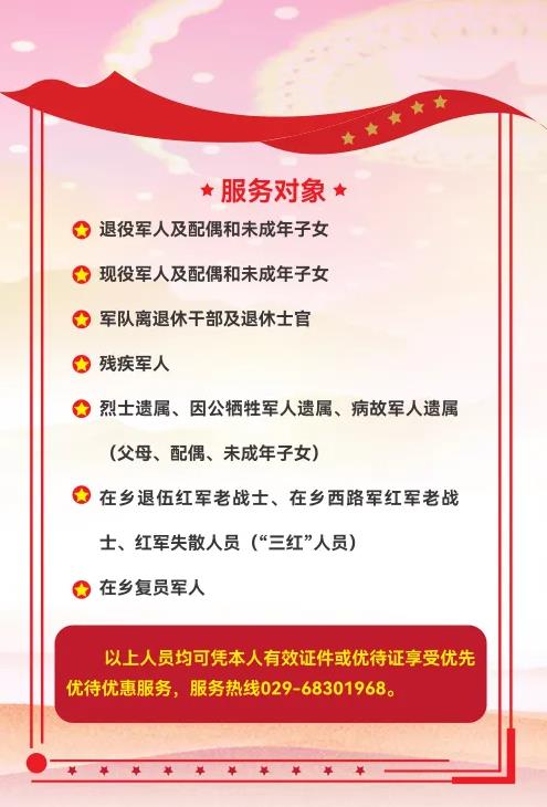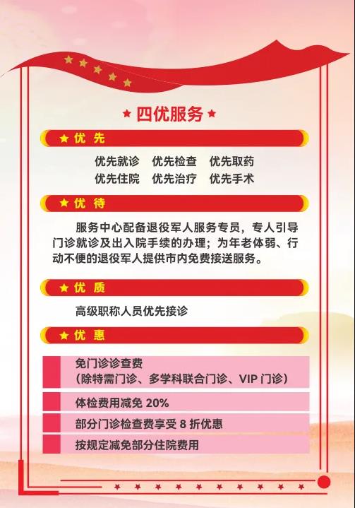 長期以來,醫(yī)院把“尊崇軍人,致敬軍屬”落到實處。一是對退役軍人實行優(yōu)撫。對退、現(xiàn)役軍人及其配偶和未成年子女;因公犧牲軍人直系親屬;軍隊離退休干部及退休士官;在鄉(xiāng)退伍紅軍老戰(zhàn)士、在鄉(xiāng)西路軍紅軍老戰(zhàn)士、“三紅”人員;殘疾軍人;在鄉(xiāng)復員軍人等優(yōu)撫對象來院享受門診就診優(yōu)先;住院優(yōu)先;窗口手續(xù)辦理優(yōu)先;檢驗檢查優(yōu)先;城區(qū)范圍內救護車免費接送(預約電話:029—966120);特殊人員一對一陪診。二是優(yōu)撫對象就診時享受免門診診查費;部分門診檢查費享受8折優(yōu)惠;體檢費用減免20%;按規(guī)定減免部分住院費用。