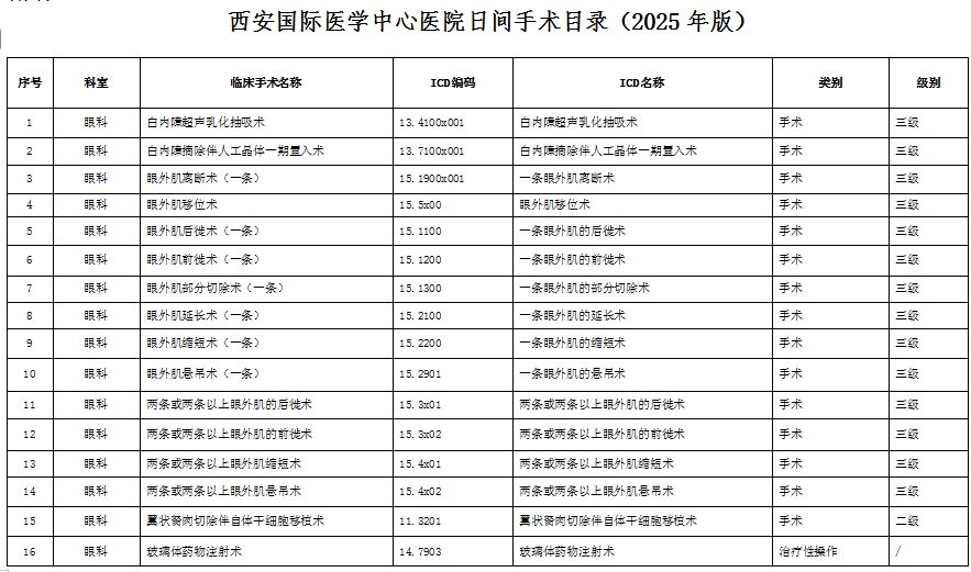 為進(jìn)一步加強(qiáng)本院日間診療管理,規(guī)范日間診療服務(wù)行為,保障日間醫(yī)療質(zhì)量與安全,按照《醫(yī)療機(jī)構(gòu)日間醫(yī)療質(zhì)量管理暫行規(guī)定》、《手術(shù)質(zhì)量安全提升行動(dòng)方案(2023—2025年)》、《提升醫(yī)療質(zhì)量安全行動(dòng)計(jì)劃(2023-2025年)》等各類文件要求,現(xiàn)將本院2025年度日間手術(shù)目錄公示如下: